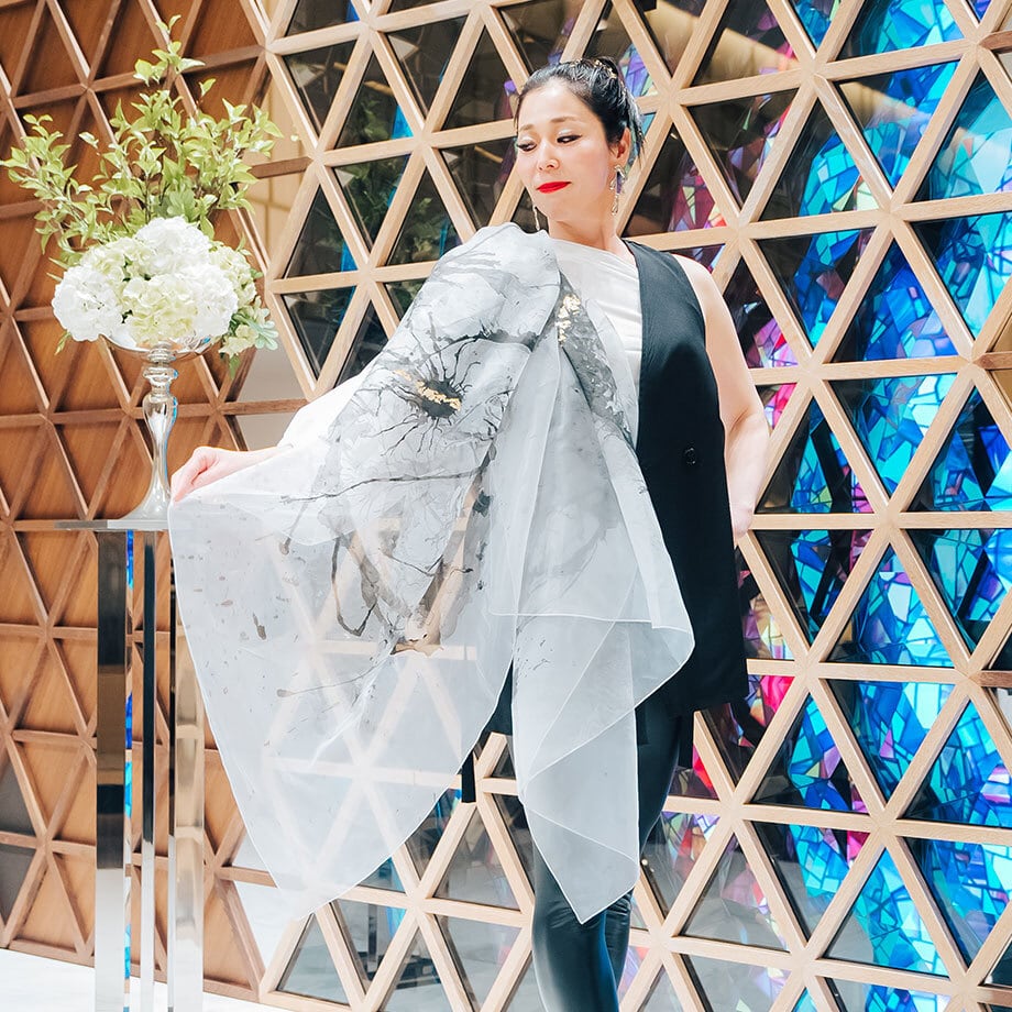 オーガンジー生地に瑠生繋(ルーツ)柄で描きました。